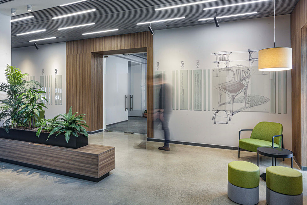The hand-drawn sketch of the iconic chair, crafted in the old factory, proudly graces the wall, bridging the gap to the building's history before and after the two World Wars.